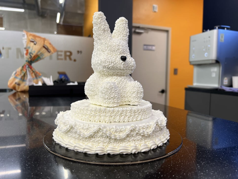누데이크와 뉴진스 콜라보로 제작된 토끼 케이크의 실물 모습